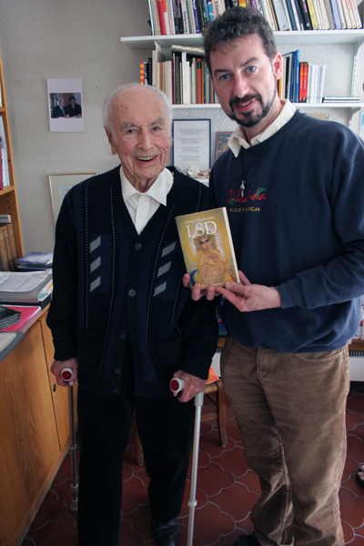 After the conference, on March 25, I was fortunate enough to visit him at his home in Rittimatte, with Jonathan Ott and Andrew Sewell. The picturesque drive up to his property--a portion of which extends into France--was straight out of Swiss calendar art with snow-capped chalets dotting the mountainside. Albert was spry and sharp as a tack, speaking to us fluently in both German and English. There was no indication during our visit that he only had a month to live. His home contained an indoor swimming pool and multiple staircases, so he clearly had ample opportunity for exercise, even inside during the winter months. Pointing out an inversion table, Jonathan Ott mentioned that Albert had constructed his own gravity boots in order to obtain the health benefits of hanging upside-down. Albert just smiled. We took in the breathtaking view from his office, and he showed us the shelf where he keeps the many translations of his book LSD -- mein Sorgenkind. He was particularly tickled by the cover art on the Czech translation depicting a bare-breasted woman with a 1970s hairdo. We then went upstairs to his library, where he showed us some of his visionary art collection.