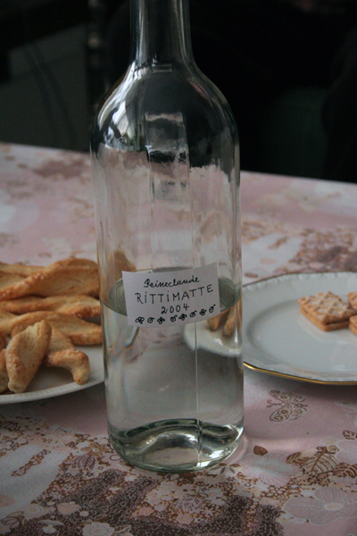 Later, back downstairs, a ceramic cat that Albert had sculpted was accompanied by an occasional mew from his pet cat. He proudly offered us schnapps that he had distilled in 2004 from plums he had picked off of trees on his property that grew from pits he had planted some thirty-seven years earlier when he bought the place. Now that's going the whole nine yards to make some booze! Jonathan declared it to be "Hofmann's other elixir"; the taste was clean, clear, and potent. Albert joyfully recounted stories of past exploits as we sat enthralled. Eventually we said our goodbyes, and drove back down the mountain. I feel honored to have been able to spend some time with Dr. Hofmann at his home.
